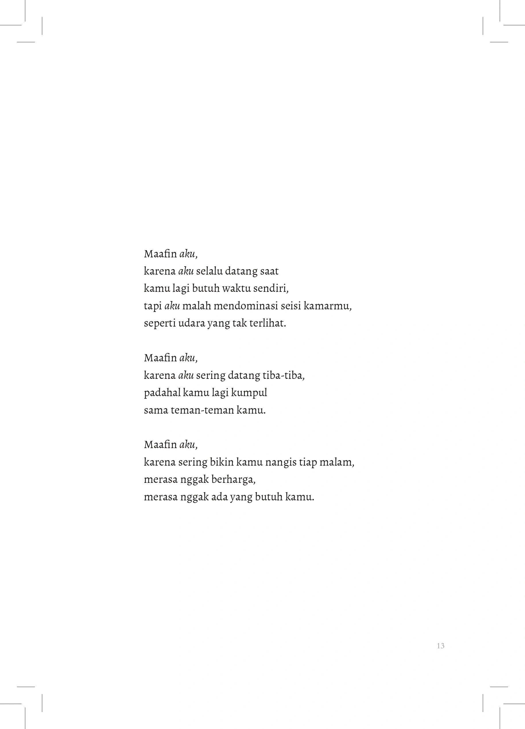 Maafin aku, karena sering bikin kamu nangis tiap malam, merasa nggak berharga, merasa nggak ada yang butuh kamu.