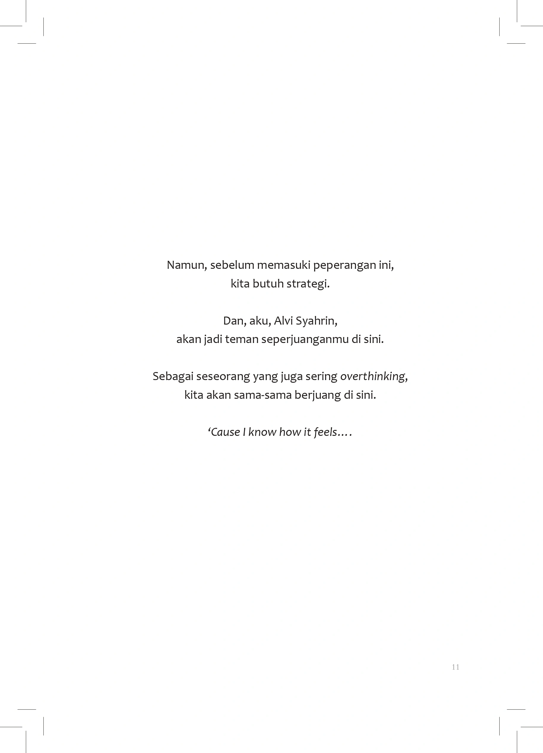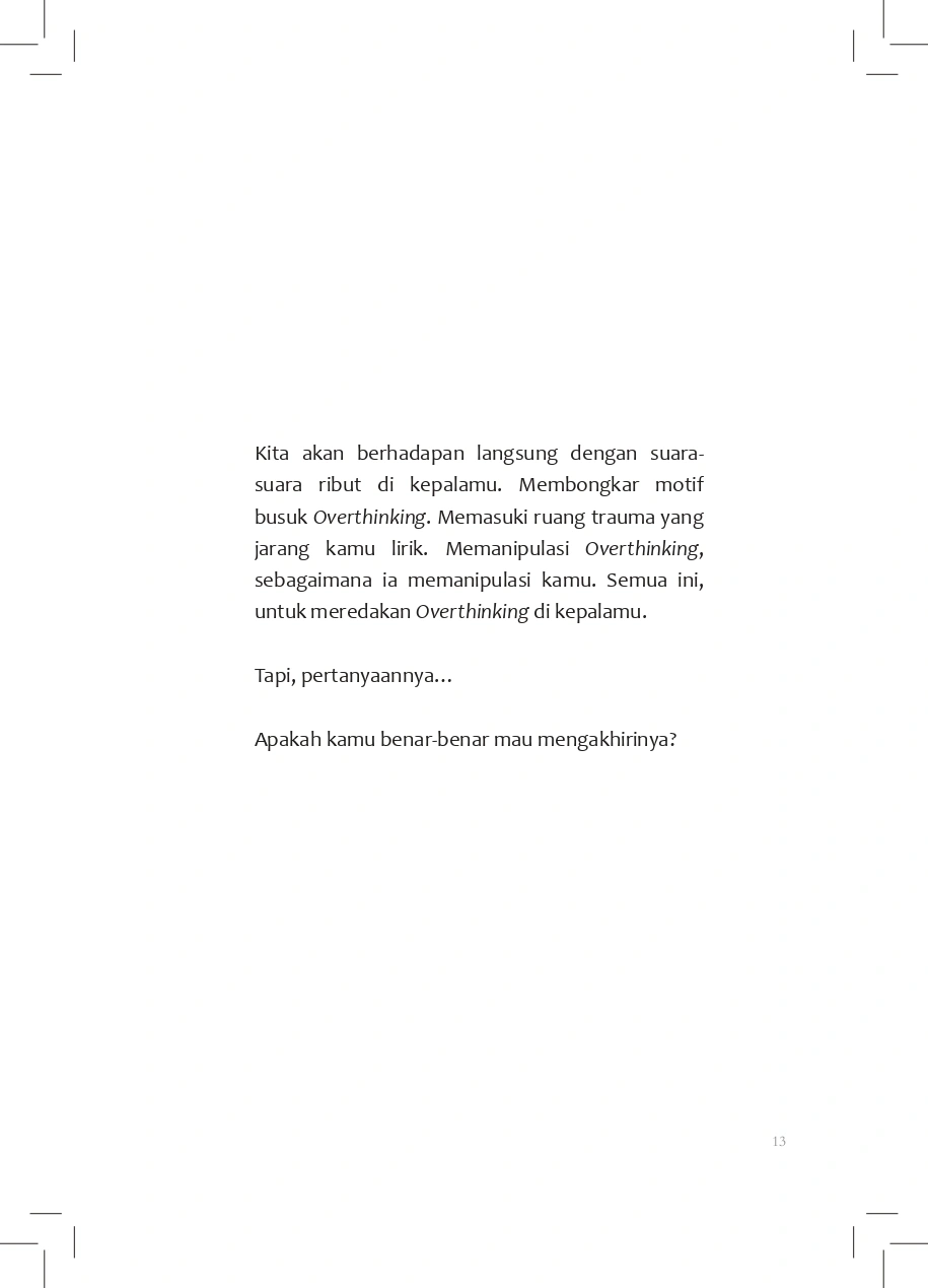 Kita akan berhadapan langsung dengan suara-suara ribut di kepalamu. Membongkar motif busuk Overthinking. Memasuki ruang trauma yang jarang kamu lirik. Memanipulasi Overthinking, sebagaimana ia memanipulasi kamu. Semua ini, untuk meredakan Overthinking di kepalamu.