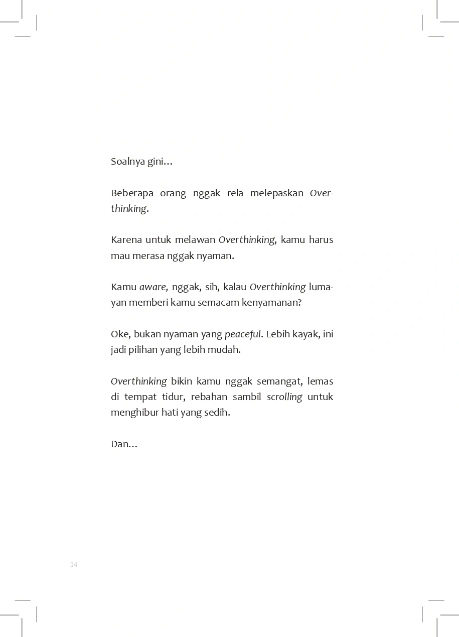 Bukankah kamu sering dengar Overthinking berbisik hal-hal kayak… percuma berharap lebih, nanti terluka lagi; percuma berjuang lebih, nanti gagal lagi? Lalu, ia membuatmu nggak berani ke mana-mana dan berkembang?