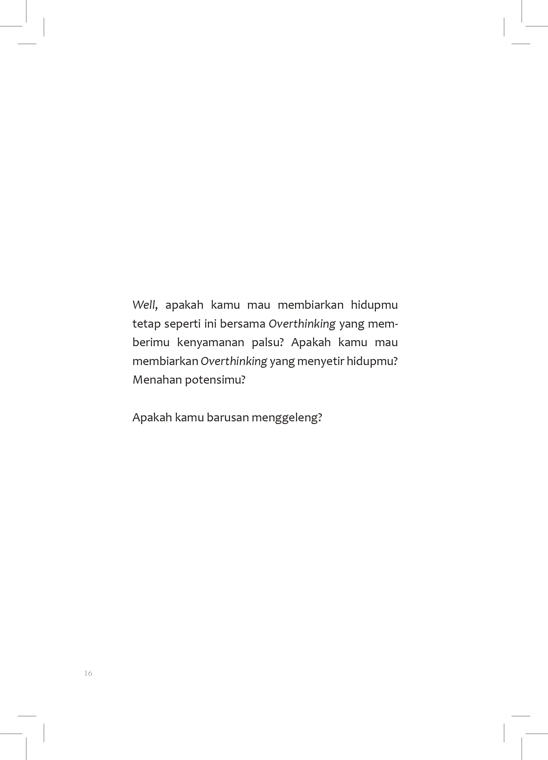 Well, apakah kamu mau membiarkan hidupmu terus seperti ini bersama Overthinking yang memberimu kenyamanan palsu? Apakah kamu mau membiarkan Overthinking yang menyetir hidupmu? Menahan potensimu?